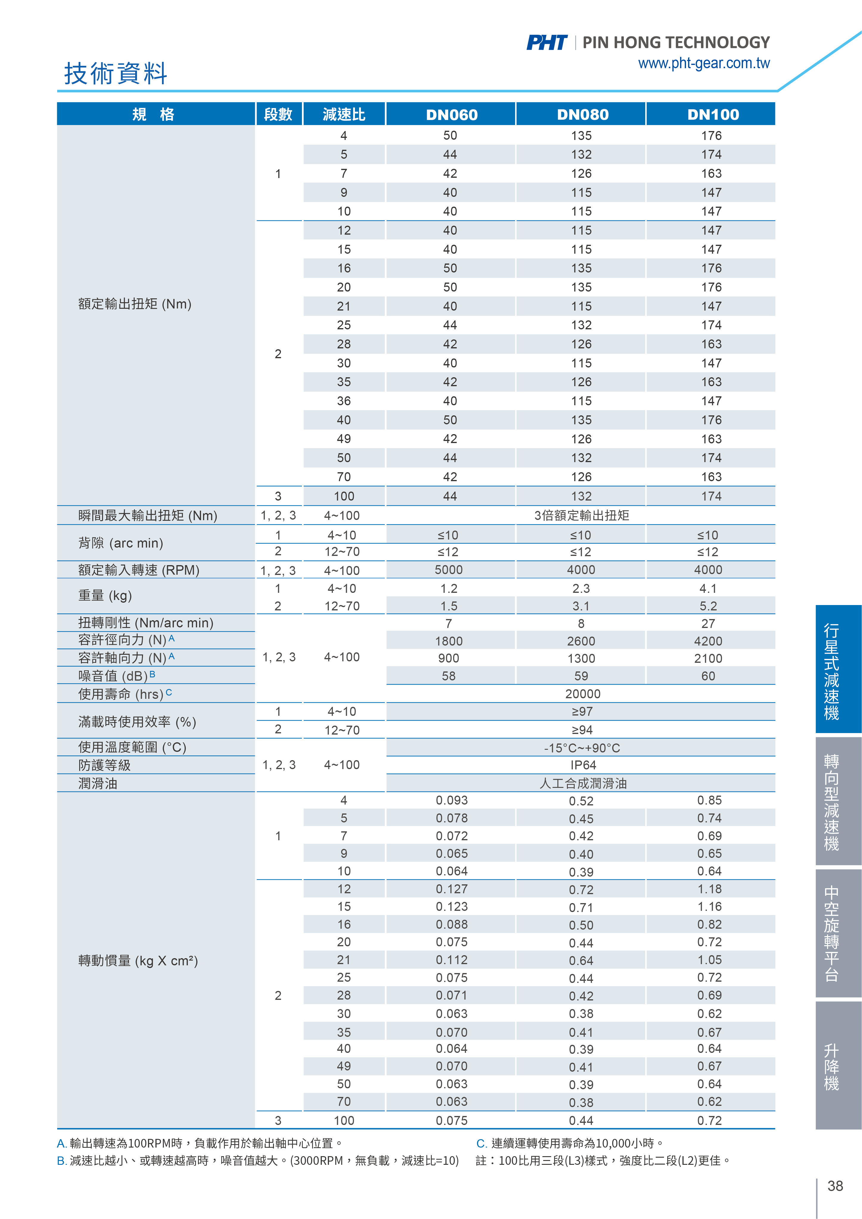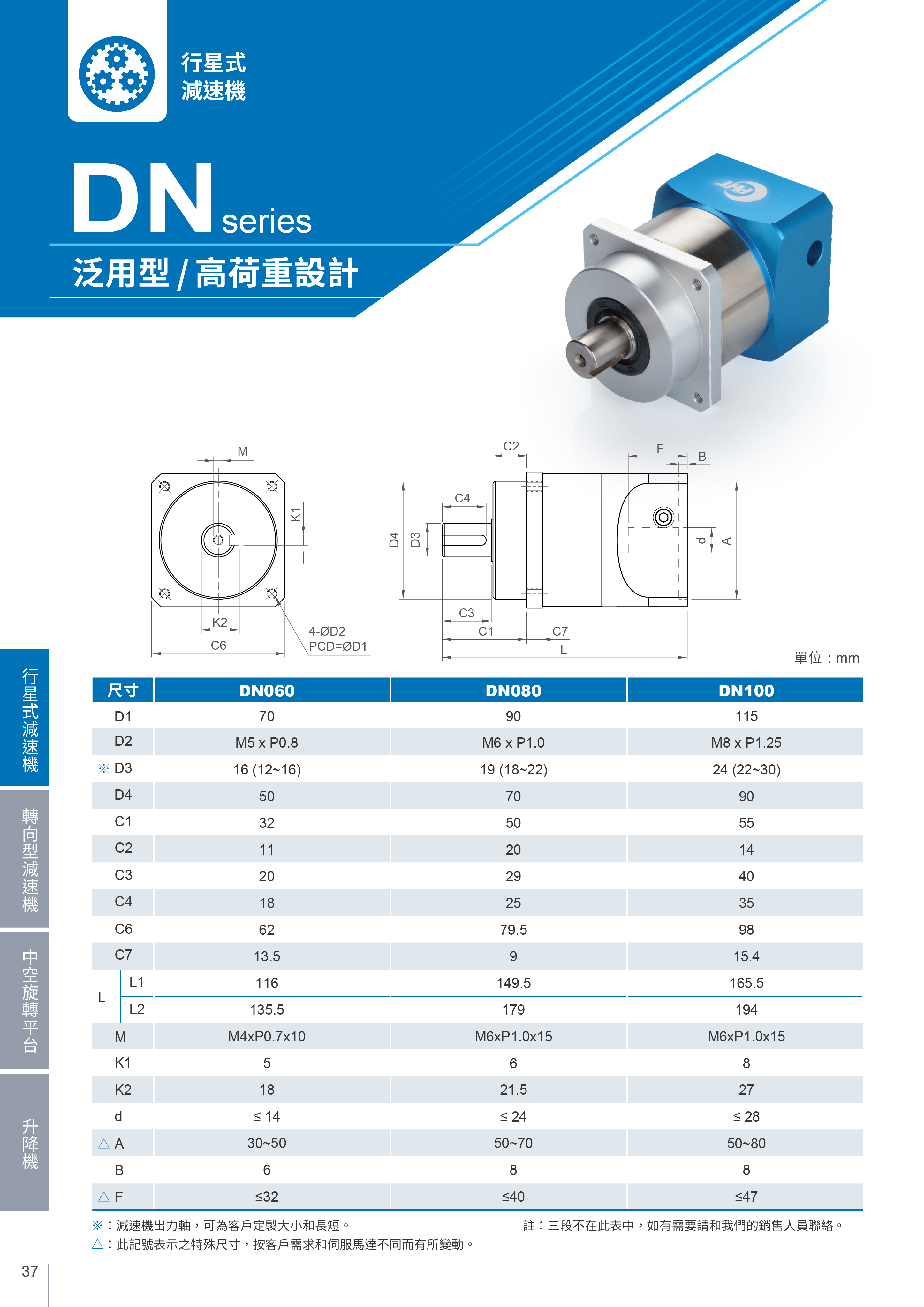 DN高荷重型减速机,能承受较大轴向径向推力,适用产业应用例如:自动化产业设备、TFT/LCD光电设备等。齿轮选用高级铬钼合金钢材,高转矩、高刚性、安装容易,适合各种厂牌的伺服马达安装。